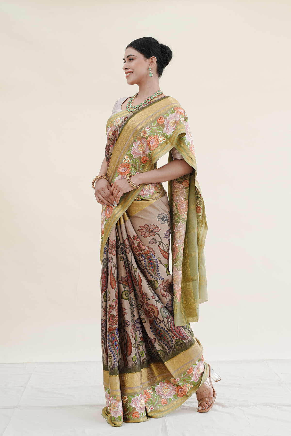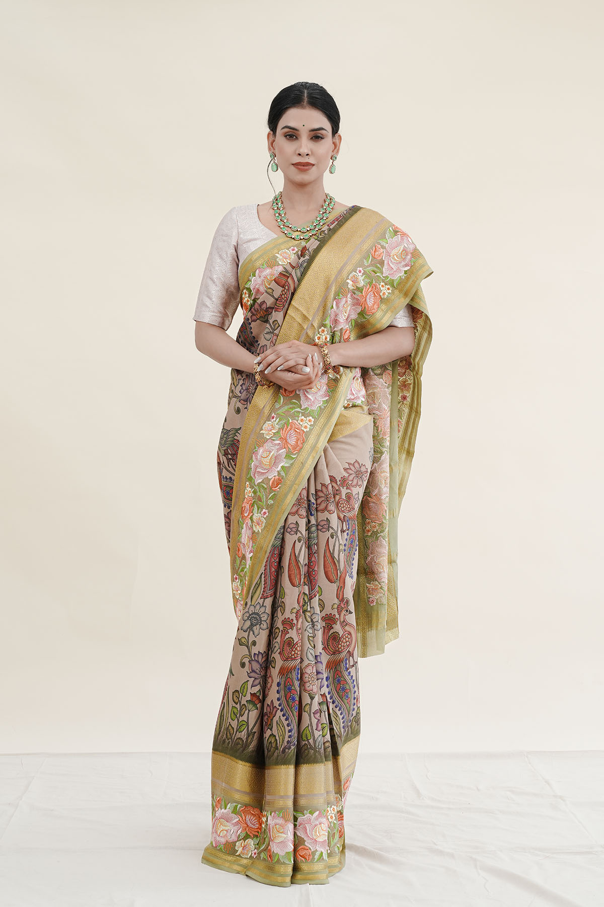 Soft beige Mysore silk crepe adorned with delicate motifs and a subtly embroidered border, this saree radiates understated elegance.