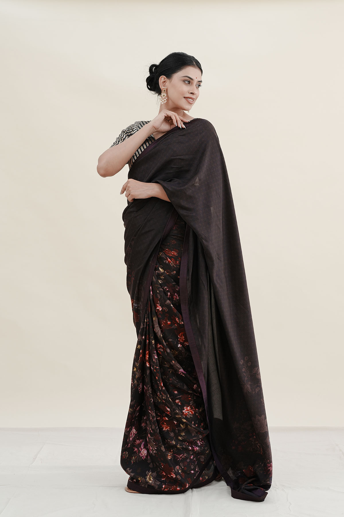 Set in a deep black tone, this crepe silk saree is brought to life with subtle floral prints that add contrast and character.