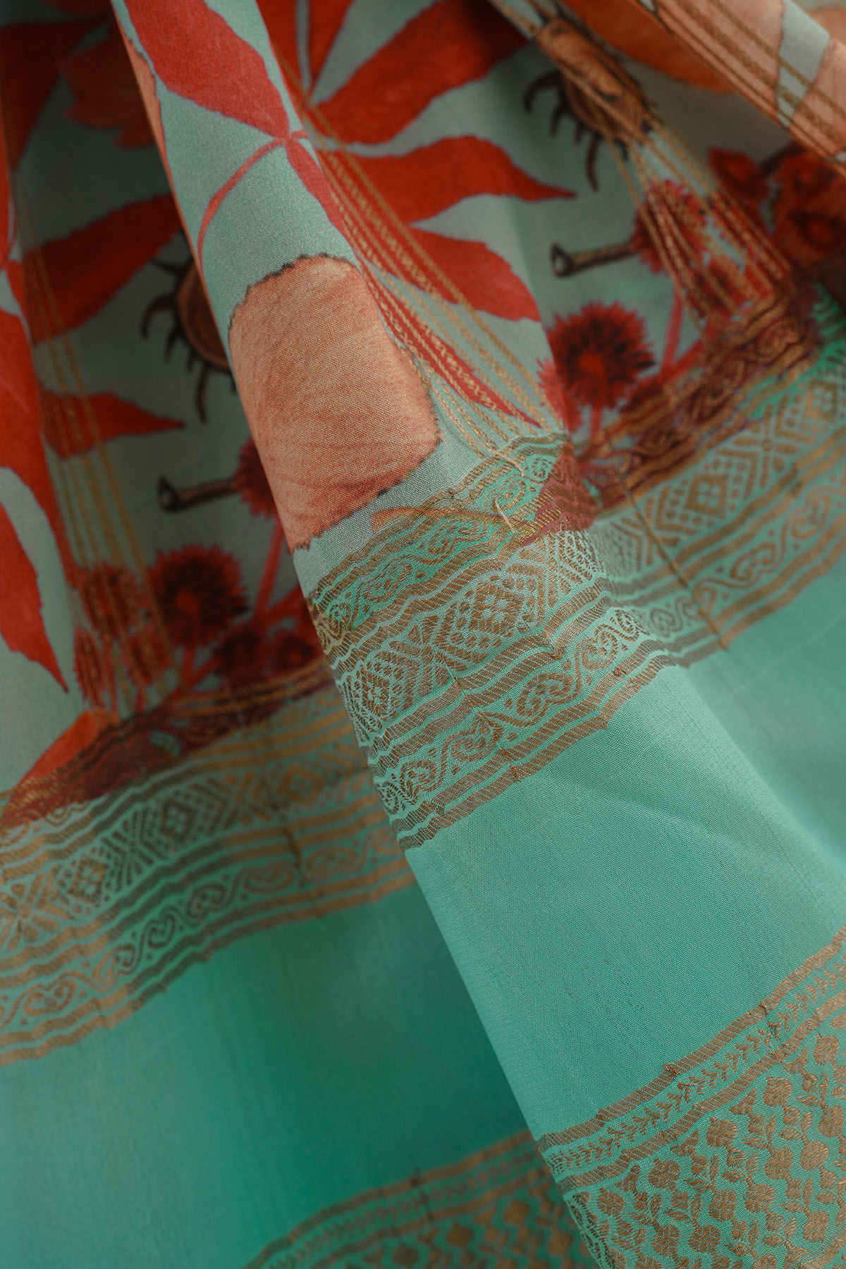 Celestine Blue Mysore Silk Crepe Saree with Orange Motifs