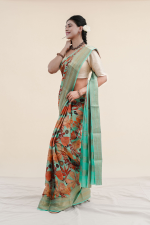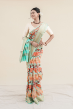 Where the calm of celestine blue meets the vibrancy of orange blooms, our Mysore silk crepe saree is a celebration of harmony in motion.