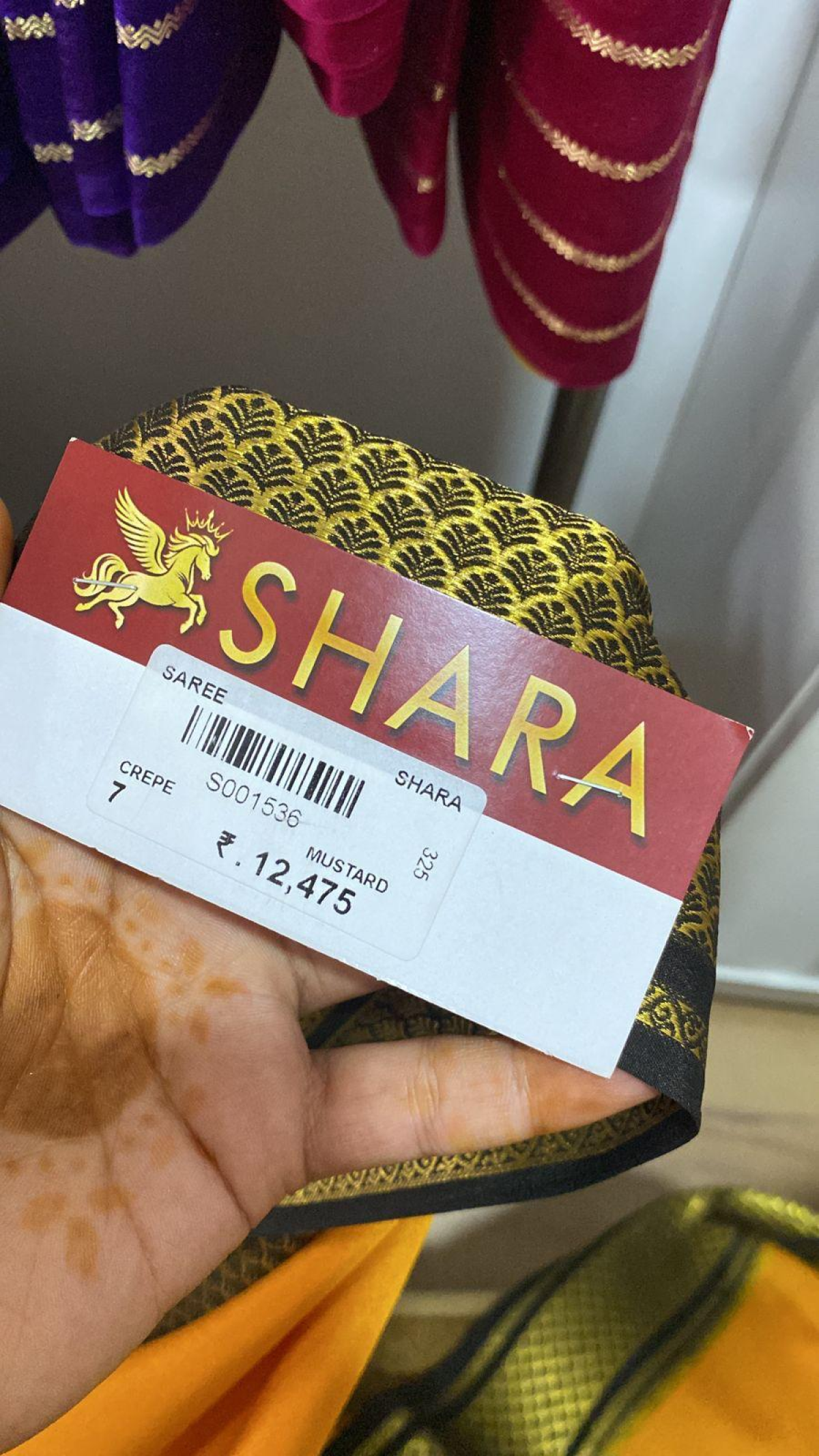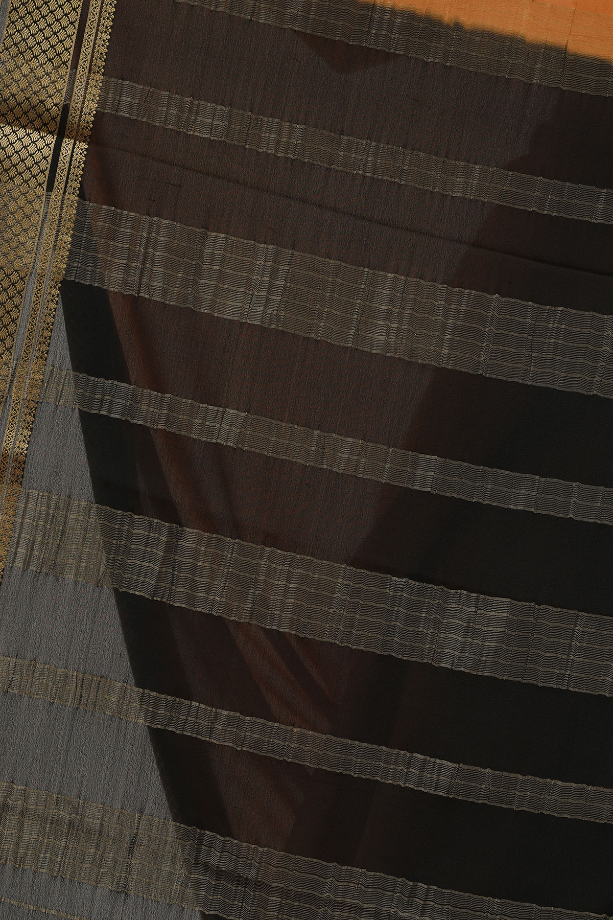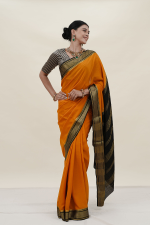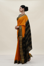 A striking fusion of fiery orange and deep black, lifted by the shimmer of golden zari, our Mysore silk crepe saree exudes bold sophistication.