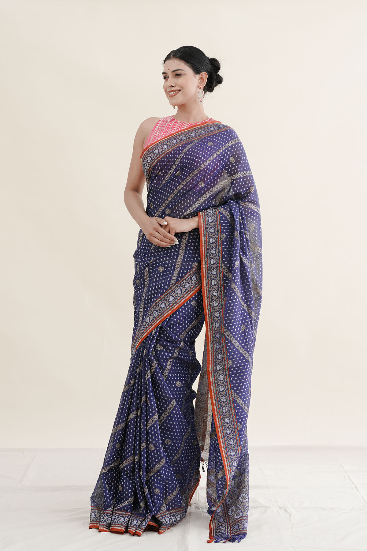 Classic Jamdani saree woven in fine muslin cotton, this navy blue piece reflects the beauty of traditional handloom craftsmanship.