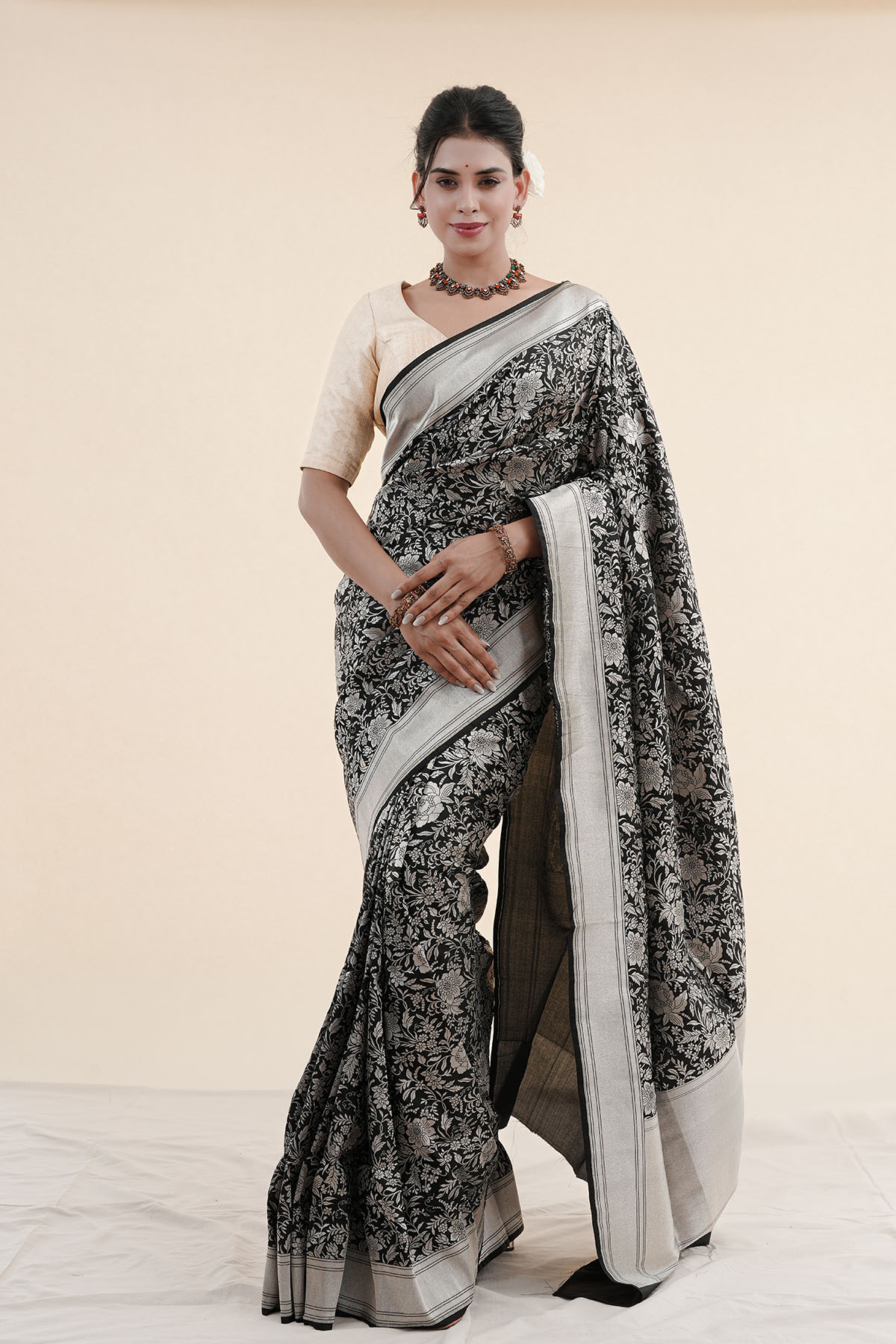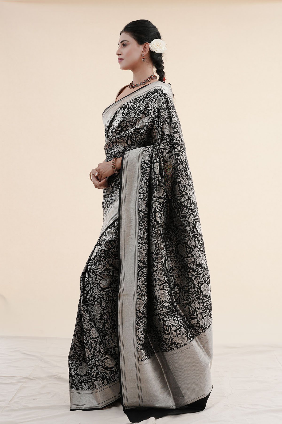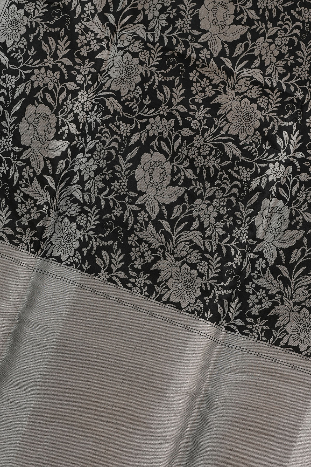 A deep black silk embroidered with Floral Jaal Kadwa motifs, designed for all the women whose aura speaks louder than words.