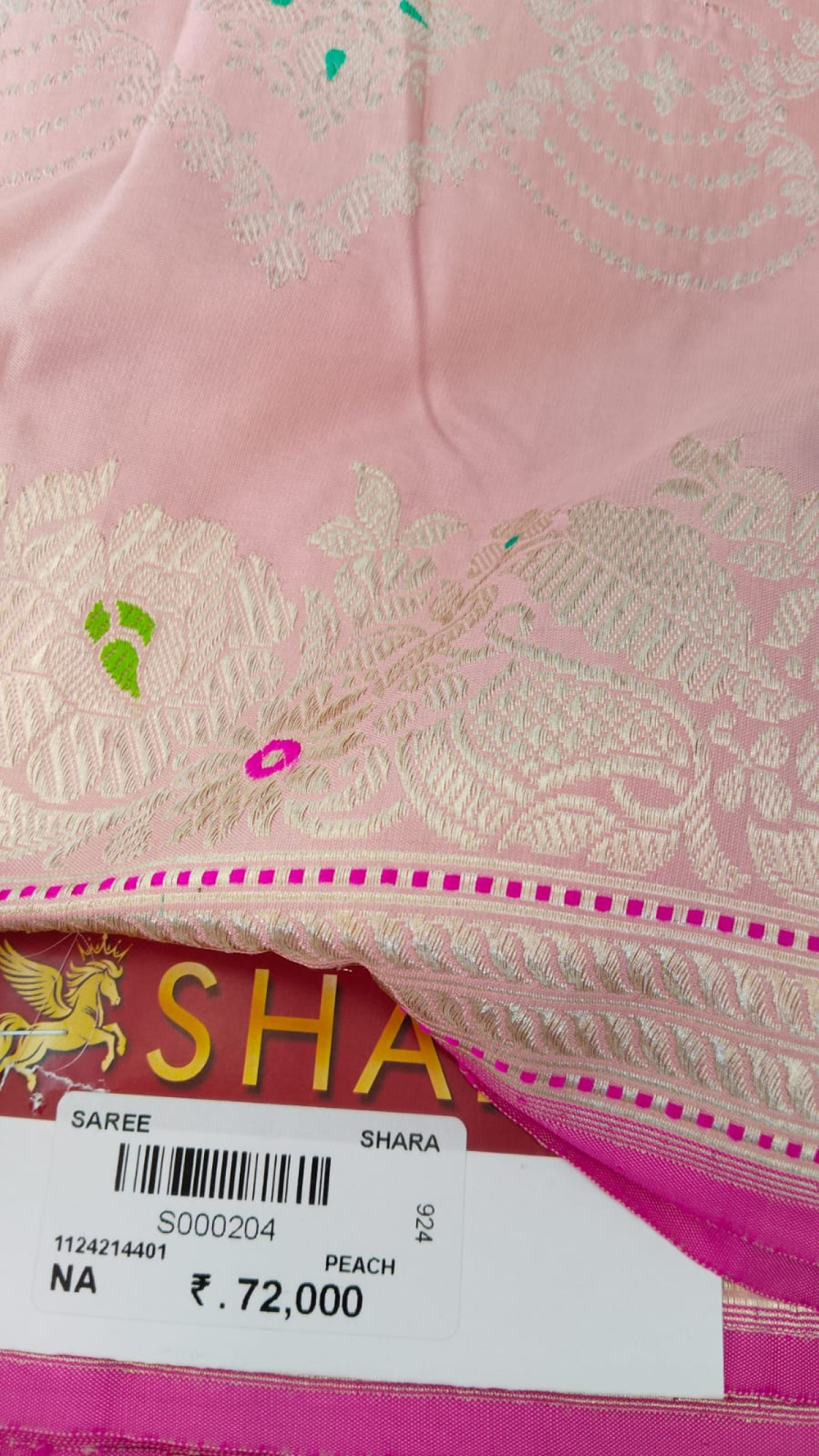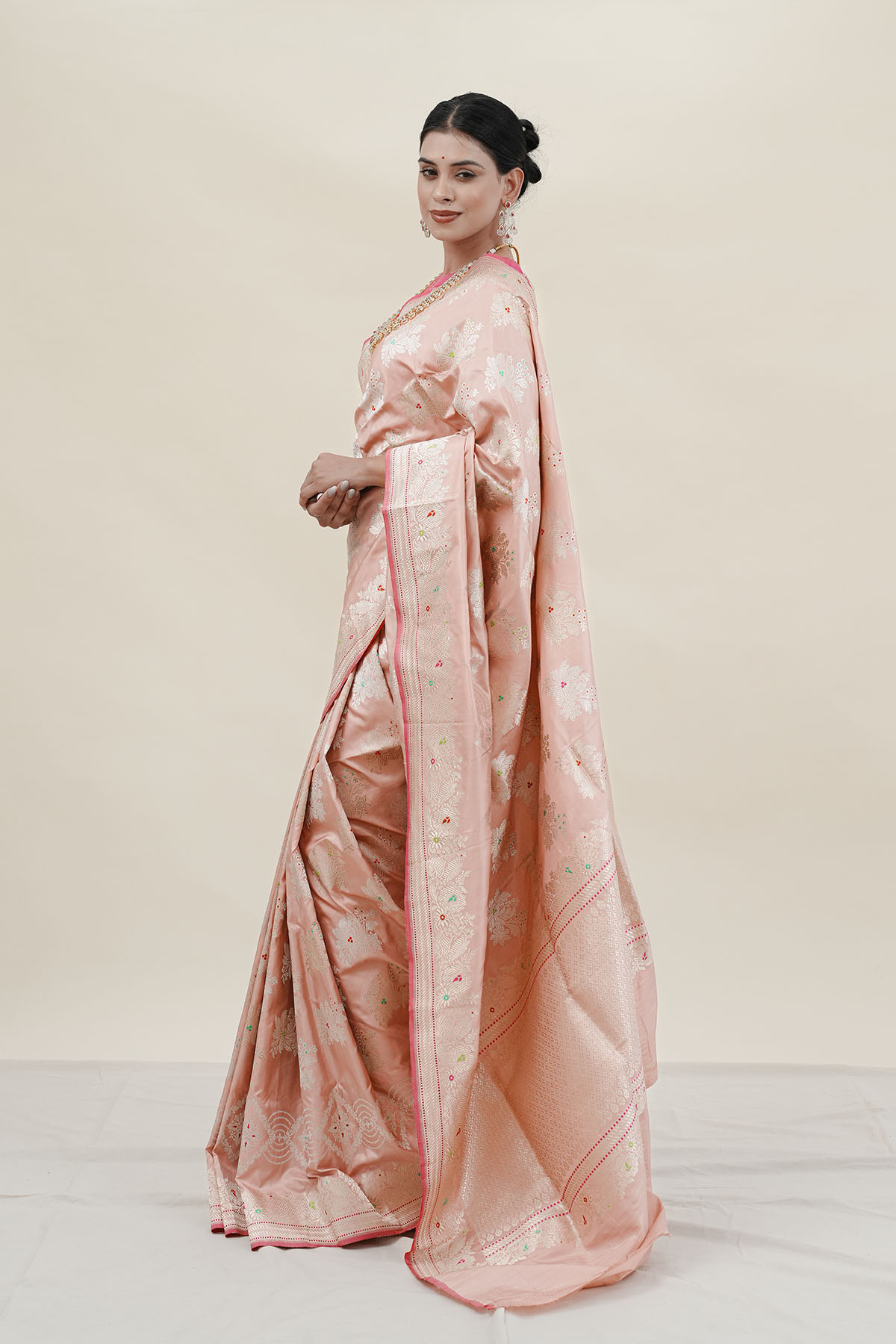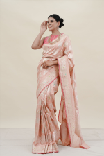 Handloomed by master artisans, every thread carries the quiet poetry of centuries-old craftsmanship. The soft peach hue adds a whisper of modern charm, while the intricate zari work preserves the regal soul of Banaras.