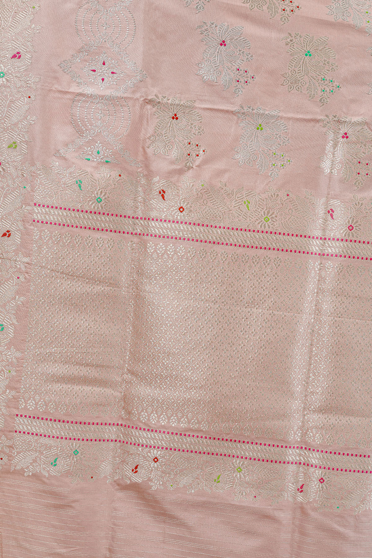Technique: An enduring Kadwa weave. The elaborate and laborious Kadwa (Kadhua) technique involves hand-weaving each motif separately. It takes longer on the handloom, but makes a more robust pattern, which stands out on the fabric.