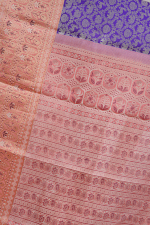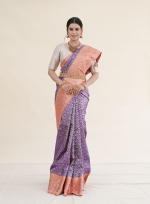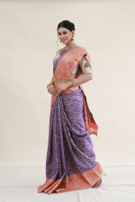 A regal Kanchipuram saree in a rich purple hue, beautifully complemented by a striking red border, this piece reflects timeless South Indian craftsmanship.
