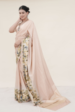 A lustrous satin silk saree finished with a graceful floral border, this piece exudes refined sophistication with a gentle touch of charm.