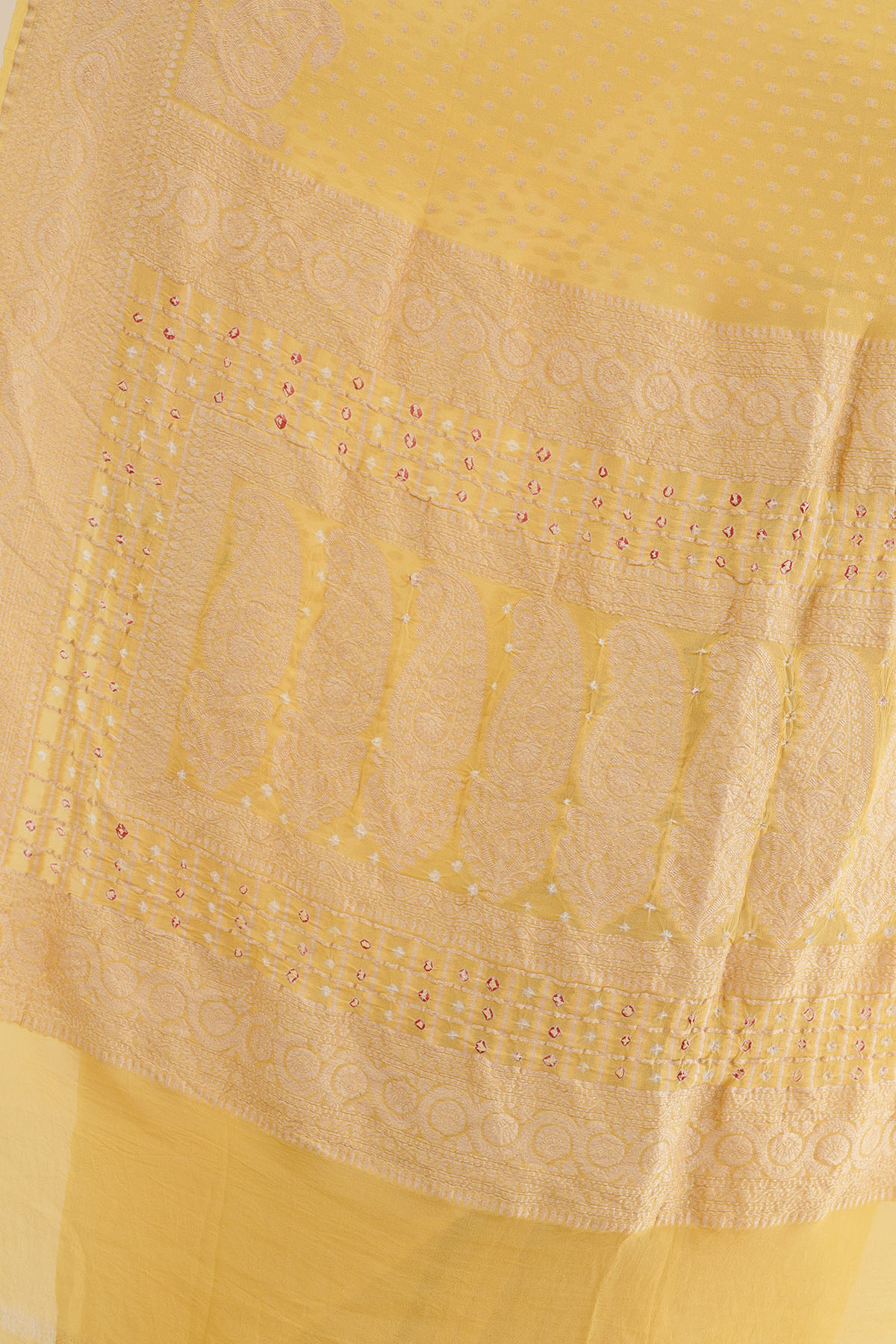 The lightweight fabric drapes with ease, while the intricate Bandhani work adds texture and character - creating a look that is both classic and gracefully timeless.