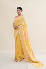 A vibrant Bandhani saree adorned with all-over buta patterns, this piece captures the beauty of traditional craftsmanship in a bright yellow hue.