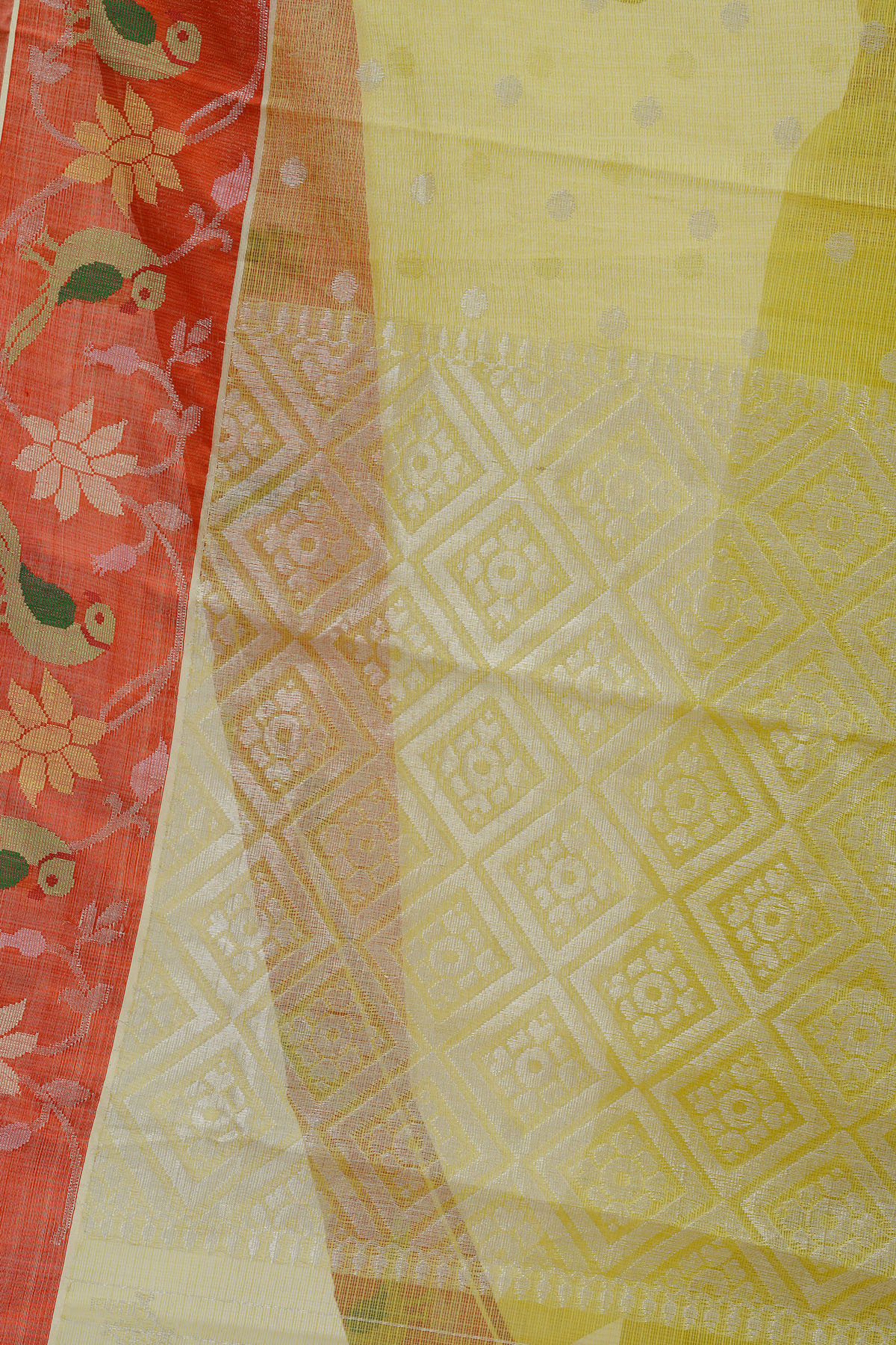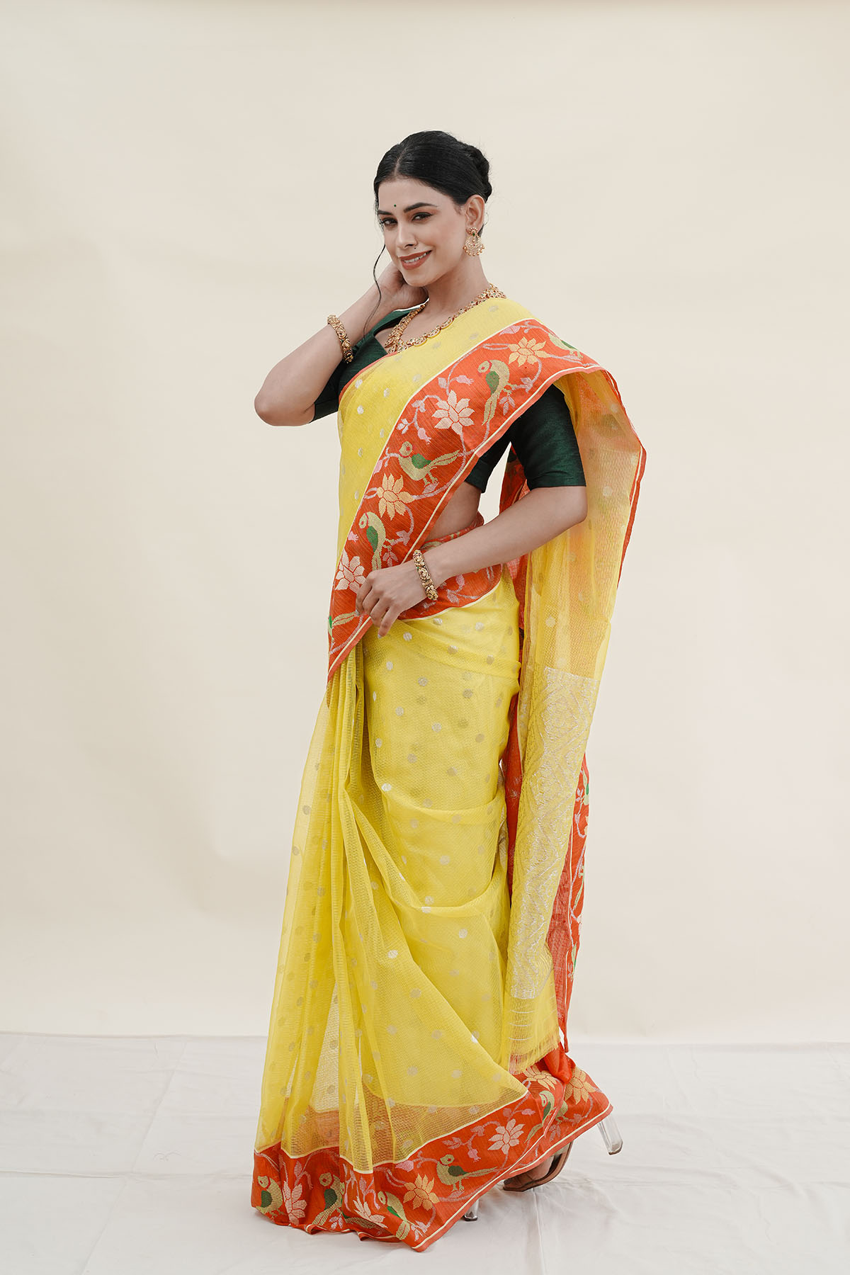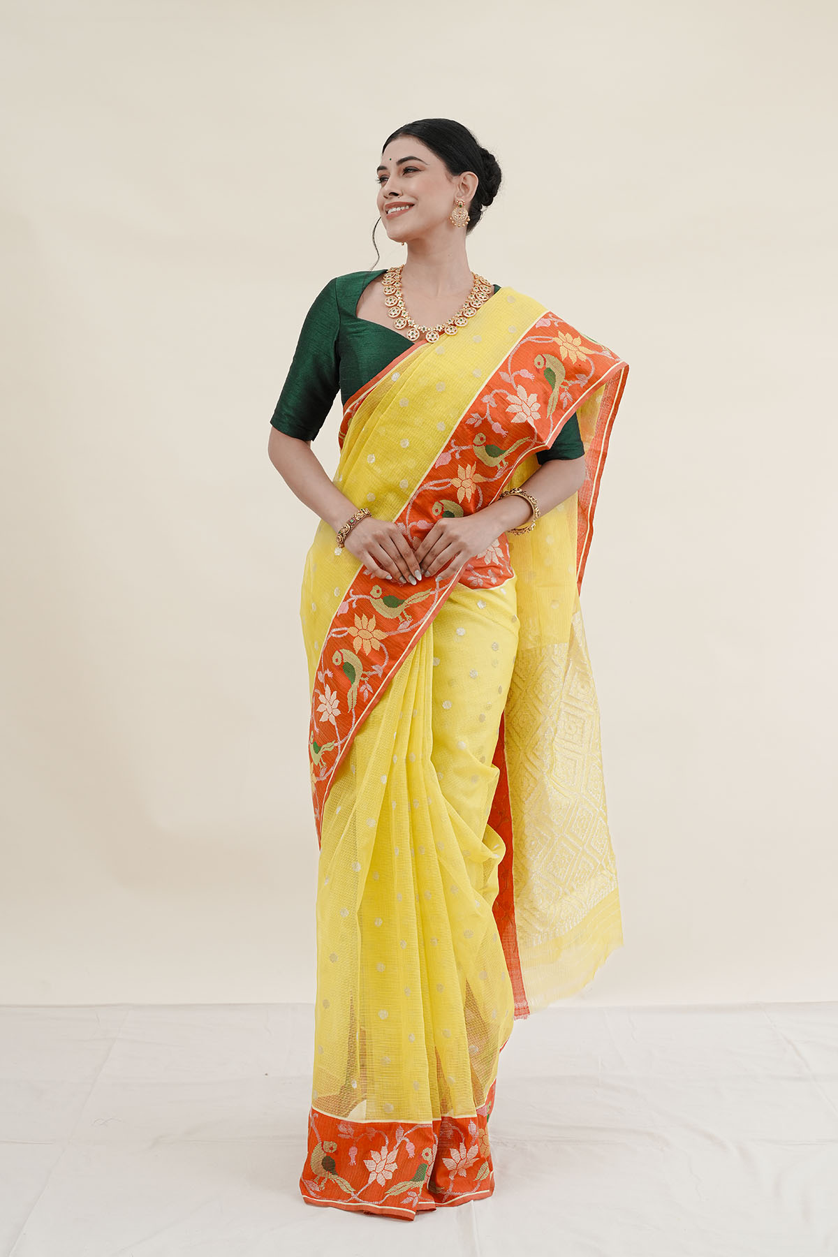Lightweight Kota silk meets the richness of a red Paithani border in this vibrant yellow saree.